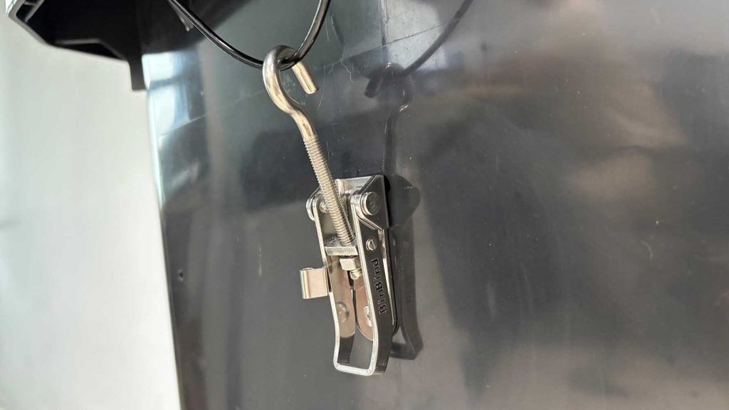 At the heart of BinBind’s design is a patent Pending over-center mechanical locking mechanism. As the locking arm closes, the flexible steel tether tightens automatically, then enters a self-holding “over-center” geometry. This ensures that the lid remains firmly sealed against animal tampering, even under force or vibration. Every detail is precision-engineered: the adjustable tension screw fine-tunes the lid fit, while the spring-loaded latch adds a secondary safety stop against accidental release.